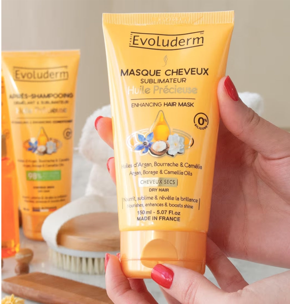 EVOLUDERM – Idée Cadeau - Routine Corps & Cheveux Huile Précieuse - 7 produits – Ingrédients d’Origine Naturelle – Végan – Fabrication Française.